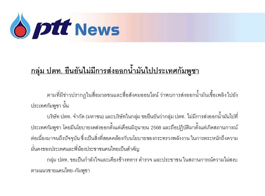 ผู้ค้าน้ำมันและโรงกลั่นน้ำมันก็หวั่นจะตกเป็นจำเลยสังคมต้องออกมาประกาศชี้แจงกันถ้วนหน้า ในส่วนบริษัท ปตท. จำกัด (มหาชน) และบริษัทในกลุ่มเช่นกัน ได้ชี้แจงว่า “ขอยืนยันว่ากลุ่ม ปตท. ไม่มีการส่งออกน้ำมันไปที่ประเทศกัมพูชา โดยมีนโยบายงดส่งออกตั้งแต่เดือนมิถุนายน 2568 และถือปฏิบัติมาตั้งแต่เกิดสถานการณ์ต่อเนื่องมาจนถึงปัจจุบัน ซึ่งเป็นสิ่งที่สอดคล้องกับนโยบายของกระทรวงพลังงาน ในการตระหนักถึงความมั่นคงของประเทศและพี่น้องประชาชนคนไทยเป็นสำคัญ”