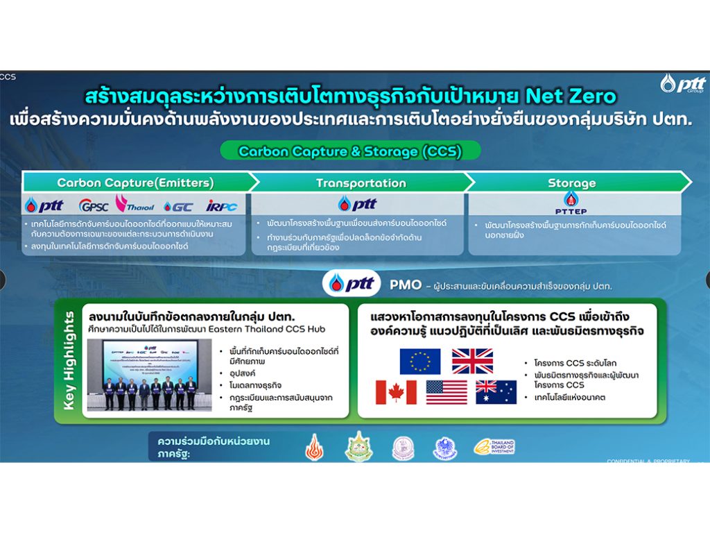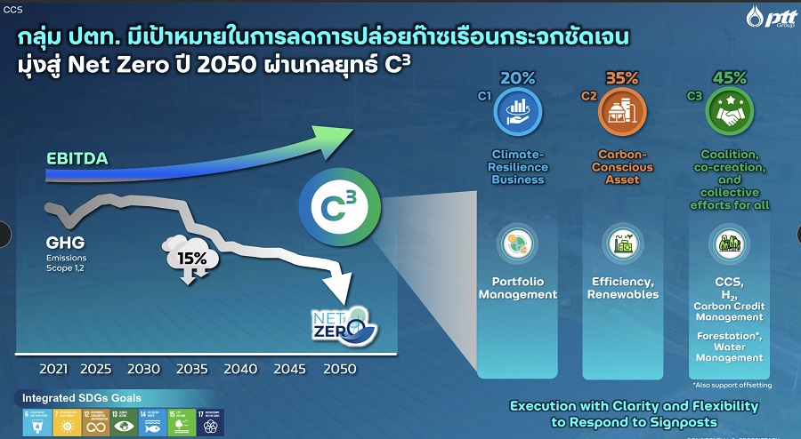 ภารกิจของปตท.ในการผลักดันให้โครงการ CCS เกิดให้ได้นั้น ด้านหนึ่งด้วยความเป็นบริษัทพลังงานแห่งชาติ อีกด้านกลุ่มปตท.มีการดำเนินธุรกิจที่ถือเป้าหมายลดการปล่อยก๊าซเรือนกระจกอย่างชัดเจน เพื่อมุ่งสู่ Net Zero ในปี 2593 พร้อมกับประเทศ ผ่านกลยุทธ์ C3 ประกอบด้วย C1 : Climate-Resilience Business โดยลดพอร์ตโฟลิโอในธุรกิจที่มีการปล่อยคาร์บอนสูง อาทิ การขายธุรกิจถ่านหินออกไป ,C2 : Carbon Conscious Asset ปรับปรุงสินทรัพย์ที่มีอยู่ เพื่อลดการปล่อยคาร์บอนจากกระบวนการผลิต และการดำเนินกิจกรรมต่าง ๆ และC3 : Coalition, Co-Creation, and Collective Efforts for All ร่วมมือระหว่างภาครัฐ ภาคเอกชน และองค์กรต่างประเทศ เพื่อผลักดันการลดคาร์บอนอย่างเป็นระบบ