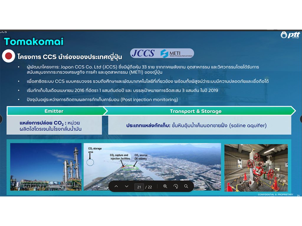 มาดูโมเดล “Tomakomai CCS Demonstration Project” ผู้พัฒนาโครงการนี้ คือ Japan CCS Co. Ltd (JCCS) ซึ่งมีผู้ถือหุ้น 33 ราย จากภาคพลังงาน อุตสาหกรรม และวิศวกรรม ได้รับการสนับสนุนจากกระทรวงเศรษฐกิจ การค้า และอุตสาหกรรม (METI) ของญี่ปุ่น วัตถุประสงค์หลัก เพื่อสาธิตระบบ CCS แบบครบวงจร รวมถึงศึกษาและพัฒนาเทคโนโลยีที่เกี่ยวข้อง พร้อมทั้งพิสูจน์ว่าระบบมีความปลอดภัยและเชื่อถือได้
