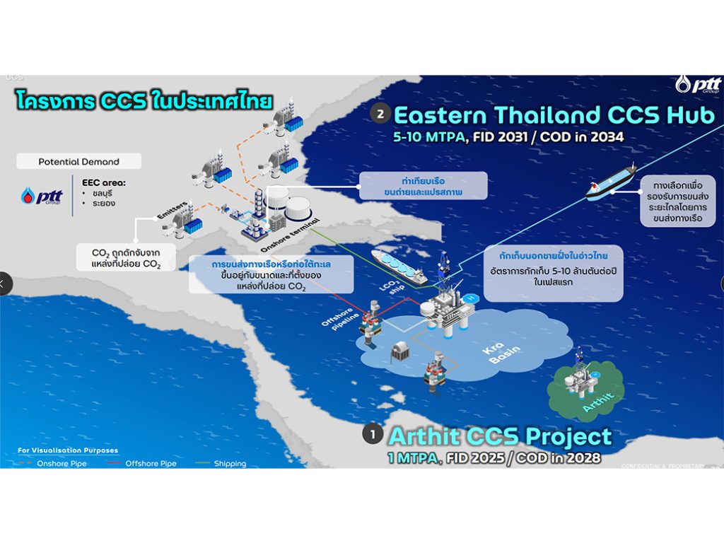 สำหรับพื้นที่ที่เหมาะสมของการทำ CCS Hub อยู่ในพื้นที่ EEC ซึ่งมีโรงงานตั้งอยู่จำนวนมาก ทั้งในชลบุรี และระยอง ครบองค์ประกอบของ CCS โดย CO₂ จะถูกดักจับจากโรงงานต่าง ๆ ที่เป็นแหล่งปล่อย จากนั้นขนส่งทางเรือ ผ่านท่าเทียบเรือขนถ่ายและแปรสภาพผ่านท่อใต้ทะเลไปกักเก็บนอกชายฝั่งในอ่าวไทย