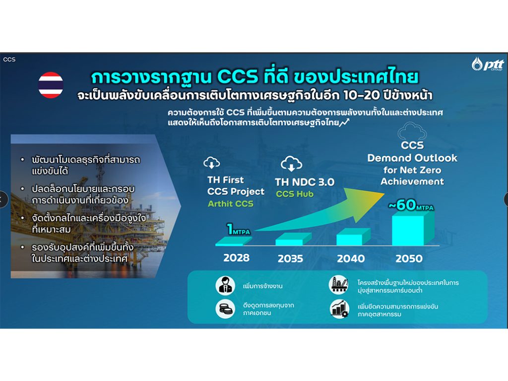 ดร.คงกระพัน อินทรแจ้ง ประธานเจ้าหน้าที่บริหาร และกรรมการผู้จัดการใหญ่ บริษัท ปตท.จำกัด (มหาชน) กล่าวว่า กลุ่มปตท.ต้องการสร้างสมดุลระหว่างการเติบโตทางธุรกิจกับเป้าหมาย Net Zero ในปี 2593 โดยร่วมมือกันทั้งกลุ่มปตท.เพื่อเดินไปด้วยกัน โดยมี CCS เป็นโครงการใหญ่ของกลุ่มที่จะมาช่วยทำให้เป้าหมายที่วางไว้สัมฤทธิ์ผล ในส่วนโครงการ Eastern Thailand CCS Hub อยู่ระหว่างร่วมมือกับหน่วยงานที่เกี่ยวข้อง ขณะเดียวกันก็แสวงหาโอกาสการลงทุนในโครงการ CCS ไปด้วย เพื่อเข้าถึงองค์ความรู้ แนวปฏิบัติ และพันธมิตรทางธุรกิจ