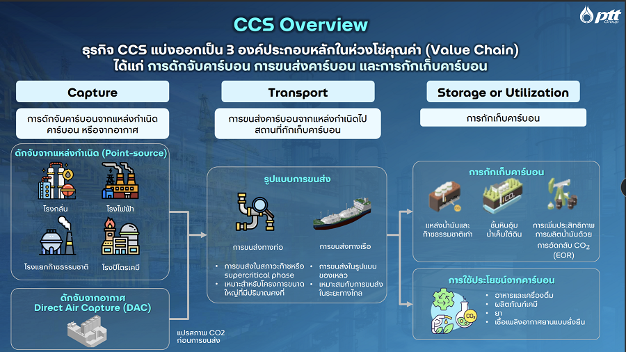 แนวทางลดการปล่อยคาร์บอน ผ่านโครงการดักจับและกักเก็บคาร์บอน (Carbon Capture and Storage : CCS) เป็นคำตอบของโลกในเวลานี้ เพื่อให้โรงงานเดินเครื่องต่อไปได้ แต่ปล่อยคาร์บอนไดออกไซด์ (CO₂) สู่ชั้นบรรยากาศน้อยลง ซึ่งจะต้องทำให้ครบและให้ดีทั้ง 3 องค์ประกอบในห่วงโซ่อุปทาน (Value Chain) ของ CCS จึงจะสมบูรณ์ ทั้งการดักจับคาร์บอน (Capture) การขนส่งคาร์บอน (Transport) และการกักเก็บคาร์บอน และการใช้ประโยชน์ (Storage or Utillization)