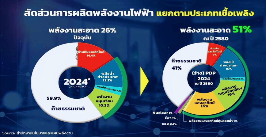 อย่างไรก็ตาม ในประเด็นเฉพาะความต้องการกำลังไฟฟ้าพลังงานสะอาด Clean Electricity Demand นั้น พบว่า ประเทศไทย Thailand มีความต้องการไฟฟ้าสะอาดเพิ่มขึ้นอย่างต่อเนื่องมาพร้อมด้วยเช่นกัน โดยได้รับแรงหนุนจากเป้าหมายการปล่อยก๊าซเรือนกระจกสุทธิเป็นศูนย์ Net-Zero Goals และความสนใจที่เพิ่มขึ้นจากภาคธุรกิจ Increased Interest from Businesses แต่ความคืบหน้ายังคงล่าช้าเนื่องจากการพึ่งพาเชื้อเพลิงฟอสซิล Reliance on Fossil Fuels ค่อข้างสูงก่อนหน้านี้ .. รัฐบาลไทย Thai Government ตั้งเป้าหมายพลังงานสะอาดไว้ อยู่ที่ 51% ภายในปี 2580 และ 74% ภายในปี 2593 ตามแผนพัฒนากำลังผลิตไฟฟ้า Power Development Plan : PDP ..