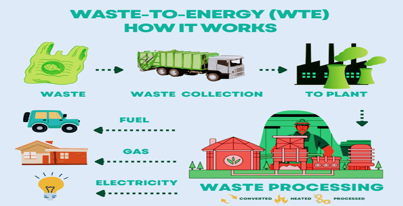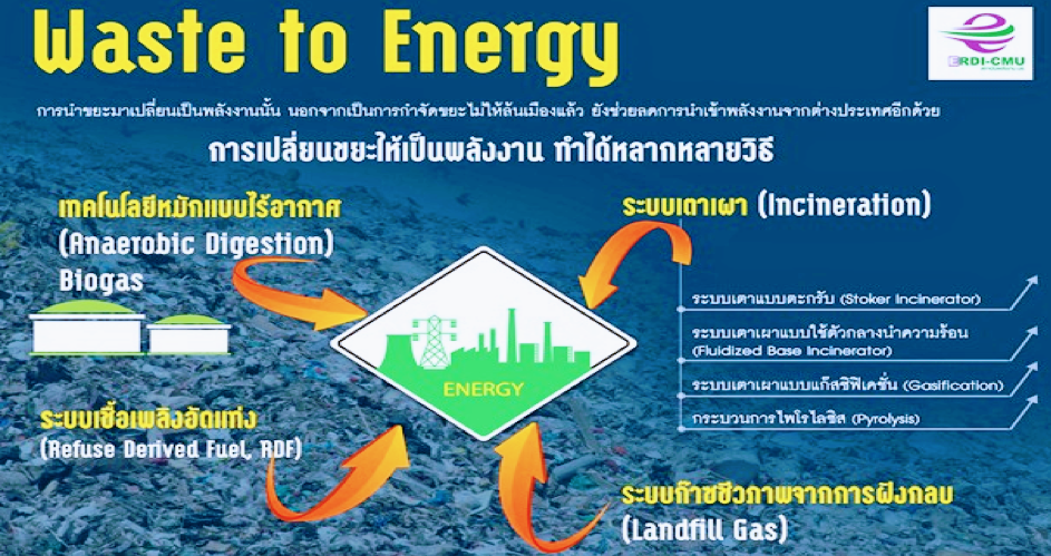 – การเปลี่ยนขยะให้เป็นพลังงาน Convert Waste into Energy : หมายถึงการเปลี่ยนของเสียที่เหลือทิ้งให้เป็นพลังงานด้วยเทคโนโลยีพลังงานจากขยะ Waste-to-Energy : WtE Technologies .. ทั้งนี้ เทคโนโลยีพลังงานจากขยะ หรือเทคโนโลยีการแปลงขยะเป็นพลังงาน Waste-to-Energy : WtE Technologies นั้น สามารถกู้คืนพลังงานจากขยะที่ไม่สามารถรีไซเคิลได้ผ่านกระบวนการต่าง ๆ เช่น การเผา Incineration, การเปลี่ยนสถานะให้เป็นแก๊ส Gasification, ไพโรไลซิส Pyrolysis, การย่อยสลายแบบไม่ใช้ออกซิเจน Anaerobic Digestion และการนำก๊าซจากหลุมฝังกลบกลับมาใช้ใหม่ Landfill Gas Recovery เป็นต้น .. วิธีการเหล่านี้ แปลงขยะให้เป็นรูปแบบของพลังงานที่มีประโยชน์ Useful Energy Forms ได้แก่ ความร้อน Heat, ไฟฟ้า Electricity และเชื้อเพลิง Fuels ซึ่งจะช่วยลดปริมาณขยะ Reducing Waste Volume, ลดการพึ่งพาเชื้อเพลิงฟอสซิล Decreasing Reliance on Fossil Fuels และลดการปล่อยก๊าซเรือนกระจก Mitigating Greenhouse Gas Emissions เมื่อเทียบกับการจบงานจัดการขยะด้วยการฝังกลบ End of Waste Management in Landfills ..