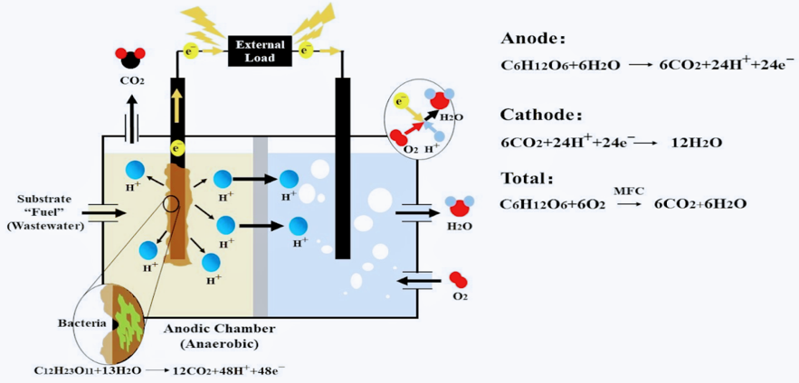 การประยุกต์ใช้เซลล์เชื้อเพลิงจุลินทรีย์ Microbial Fuel Cells : MFCs สำหรับการผลิตกำลังไฟฟ้าพลังงานสะอาด Clean Energy Power Generation และการบำบัดน้ำเสีย Wastewater Treatment ไปพร้อมกันด้วย โดยอาศัยความสามารถของจุลินทรีย์ Leveraging the Power of Microorganisms ในการย่อยสลายอินทรีย์สารในน้ำเสีย Decomposing Organic Matter in Wastewater และปลดปล่อยอิเล็กตรอนออกมา Releasing Electrons : e– คือ แนวคิดนวัตกรรมใหม่ที่ยอดเยี่ยม Great New Innovative Idea .. เทคโนโลยีชีวภาพ Biotechnology นี้ เป็นวิธีการที่ยั่งยืนในการผลิตพลังงานจากวัสดุเหลือใช้ Sustainable Way to Generate Power from Waste Materials และได้รับคาดหมายว่า พวกมันมีศักยภาพสูงในการสร้างพลังงานสะอาดจากแหล่งที่มาที่ยั่งยืน Creating Clean Energy from Sustainable Sources และยังช่วยลดต้นทุนในการบำบัดน้ำเสีย Reducing Wastewater Treatment Costs อีกด้วย ..