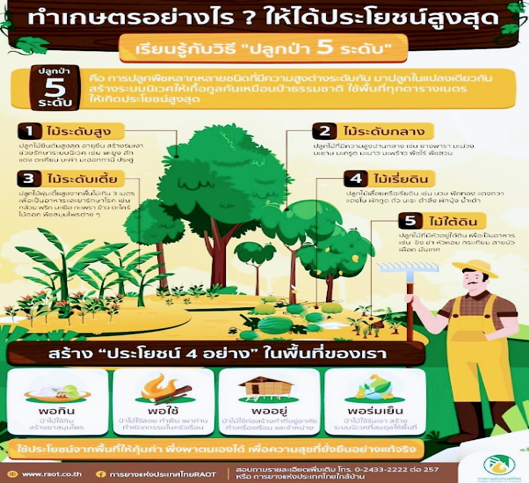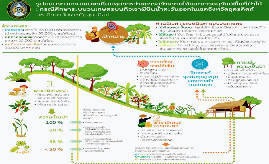 สรุปภาพรวมประโยชน์ของวนเกษตรในประเทศไทย Benefits of Agroforestry in Thailand พบว่า เกษตรกรไทย Thai Farmers สามารถสร้างรายได้จากผลผลิตหลายชนิด Multiple Products เช่น ผลไม้ Fruits, ไม้แปรรูป Timber และถั่ว Nuts แทนที่จะพึ่งพาการปลูกพืชเชิงเดี่ยว Monoculture หรือการทำเกษตรพืชผลชนิดเดียว Single-Crop Farming เช่น ยางพารา Rubber .. กระแสเงินสดที่ต่อเนื่องจากระบบวนเกษตร Continuous Cash Flow from Agroforestry Systems สามารถสร้างรายได้ที่สม่ำเสมอมากขึ้น Provide More Frequent Income ผ่านการเก็บเกี่ยวอย่างต่อเนื่อง Continuous Harvesting แทนที่จะจ่ายผลตอบแทนรายปีเพียงครั้งเดียว Single Annual Payout .. การศึกษาบางชิ้นแสดงให้เห็นว่า การปลูกต้นไม้แบบผสมผสาน Integrating Trees สามารถสร้างรายได้ที่มั่นคง และทำกำไรได้มากขึ้น More Stable & Profitable Income แม้กระทั่งชดเชยการลดลงของราคาพืชผลหลัก Compensating for Price Drops in Primary Crops ดังที่พบเห็นได้ในระบบวนเกษตร Agroforestry Systems ทั่วทุกภาคของประเทศ ..