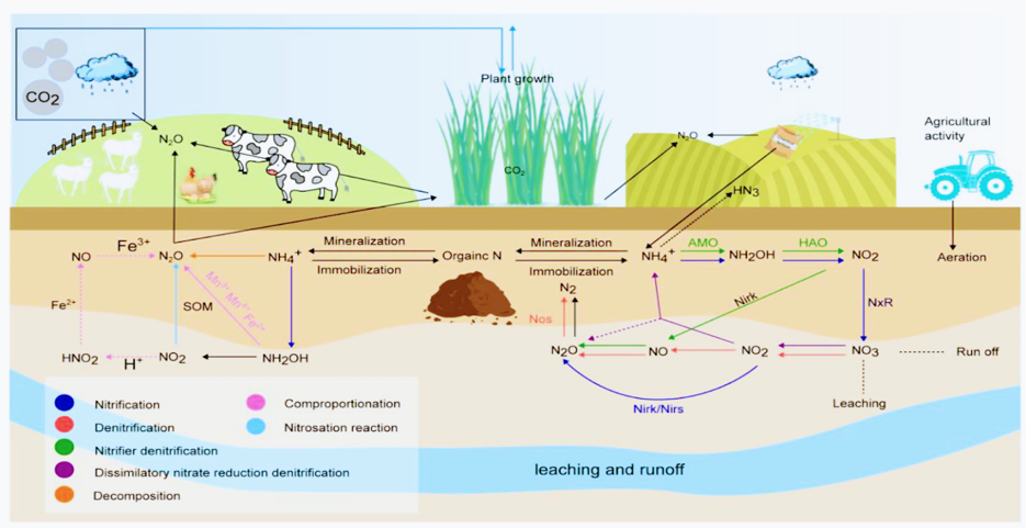 1. การเกษตร ในฐานะแหล่งกำเนิดไนตรัสออกไซด์ Nitrous Oxide : N2O ที่ใหญ่ที่สุด ซึ่งการควบคุม และลด N2O ในการทำฟาร์มเกษตรนั้น เกี่ยวข้องกับการจัดการ “วัฏจักรไนโตรเจน Nitrogen Cycle” ด้วยความมุ่งหมายเพื่อมิให้จุลินทรีย์เปลี่ยนปุ๋ยส่วนเกินเป็นก๊าซ Microbes Don’t Convert Excess Fertilizer into Gas ดังนี้ :-