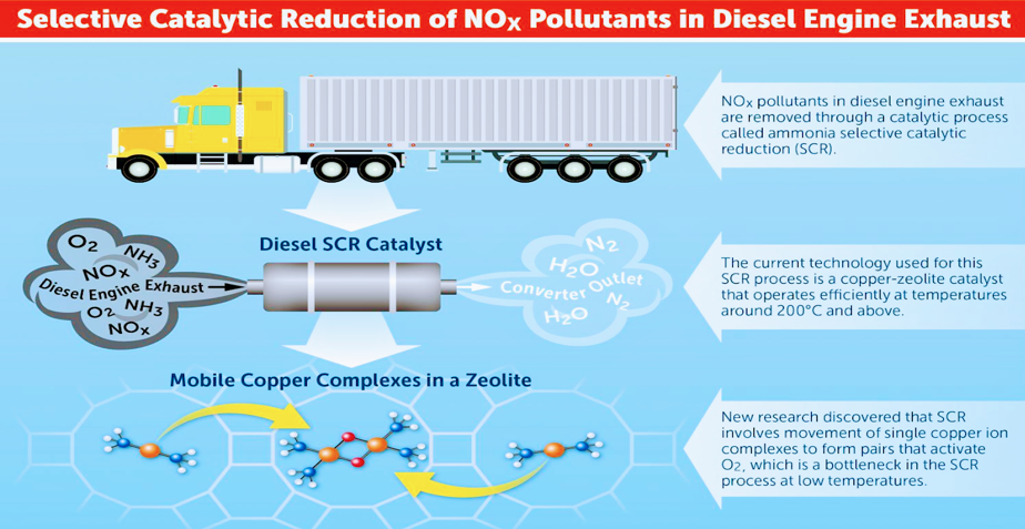 – วิธีการทำงาน How it Works : ได้แก่ การฉีดอัดแอมโมเนีย Ammonia : NH3 หรือยูเรีย Urea : CH4N2O เข้าไปในไอเสีย .. นอกจาก Ammonia : NH3 และยูเรีย Urea แล้ว ตัวเร่งปฏิกิริยา Catalyst โดยปกติ คือ วาเนเดียม Vanadium : 23V หรือซีโอไลต์ Zeolite : (Na2,K2,Ca,Ba)[(Al,Si)O2]x·nH2O เช่น Mineral Natrolite : Na2Al2Si3O10·2H2O, Chabazite : (Ca,Na2)Al2Si4O12·6H2O และ Scolecite : CaAl2Si3O10·3H2O เป็นต้นนั้น จะเปลี่ยน NOx ให้เป็นไนโตรเจน Nitrogen : N2 และน้ำ Water H2O ไปพร้อมด้วยเช่นกัน ..