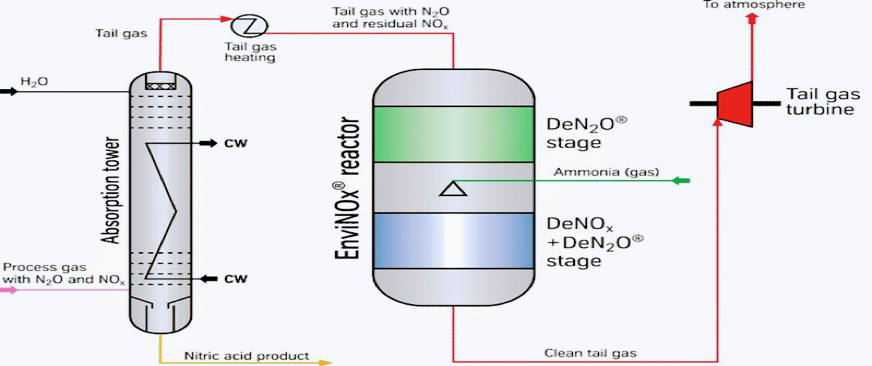 – การสลายตัวแบบเร่งปฏิกิริยา Catalytic Decomposition หรือการลดมลพิษขั้นที่สาม Tertiary Abatement : หมายถึง การใช้ระบบอุปกรณ์เฉพาะสำหรับโรงงานผลิตกรดไนตริก และกรดอะดิปิก Specific to Nitric Acid : HNO3 & Adipic Acid : C6H10O4 Plants ซึ่งเครื่องปฏิกรณ์เฉพาะทาง Specialized Reactors เช่น ระบบ EnviNOx® ที่มีจำหน่ายอยู่ในตลาด จะสลายโมเลกุล N2O ให้กลายเป็นออกซิเจน Oxygen : O2 และไนโตรเจน Nitrogen : N2 ซึ่งนี่คือ วิธีที่มีประสิทธิภาพมากที่สุด Best Available Technology ที่ใช้งานงานกันอยู่ในสหภาพยุโรป European Union : EU และสหรัฐฯ United States: US สำหรับการกำจัด N2O จากกระบวนการผลิตทางเคมีอุตสาหกรรม Chemical Manufacturing ..