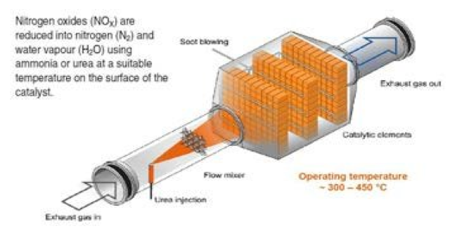 ในขณะที่ การลดไนโตรเจนออกไซด์ Nitrogen Oxides : NOx ในโรงไฟฟ้า และโรงงานขนาดใหญ่นั้น ใช้ระบบระบบบำบัดไอเสียที่ใช้ตัวเร่งปฏิกิริยา Selective Catalytic Reduction : SCR โดยการฉีดสารละลายยูเรีย Urea : CO(NH2)2 หรือแอมโมเนีย Ammonia : NH3 เข้าไปผสมในไอเสียเพื่อทำปฏิกิริยาเคมีเปลี่ยน NOx เป็นน้ำ Water : H2O และก๊าซไนโตรเจน Nitrogen : N2 Gas ที่ปลอดภัย ..