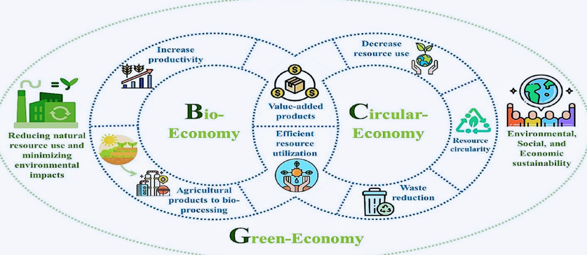 เศรษฐกิจสีเขียว Green Economy หรือ Green Economics คือ ระบบเศรษฐกิจที่มุ่งเน้นการสร้างมูลค่าทางเศรษฐกิจ Creating Economic Value และผลิตภัณฑ์เพิ่มมูลค่า Value – Added Products ด้วยการพัฒนาเศรษฐกิจควบคู่ไปกับการรักษาสิ่งแวดล้อม และความเป็นอยู่ที่ดีของมนุษย์อย่างยั่งยืน Economic Development alongside Environmental Conservation & Sustainable Human Well – Being โดยลดผลกระทบต่อระบบนิเวศ และทรัพยากรธรรมชาติ Reducing the Impact on Ecosystems & Natural Resources .. แนวคิดนี้ เน้นการใช้ทรัพยากรอย่างมีประสิทธิภาพ Efficient Resource Use, ลดการปล่อยมลพิษ และก๊าซเรือนกระจก Reducing Pollution & Greenhouse Gas Emissions และส่งเสริมการเติบโตทางเศรษฐกิจที่คำนึงถึงความยั่งยืนในระยะยาว Promoting Economic Growth with Long – Term Sustainability ..