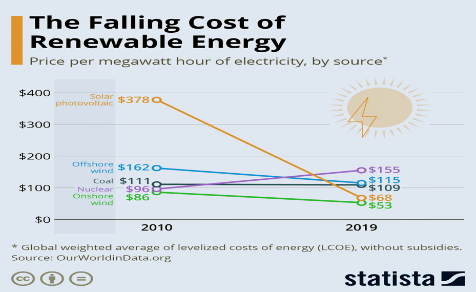 เรื่องราวการเติบโตนี้ เพิ่งจะเพียงเริ่มต้นขึ้นเท่านั้น ในขณะที่ประเทศต่าง ๆ ตั้งวัตถุประสงค์ที่จะบรรลุเป้าหมายการลดคาร์บอนที่ทะเยอทะยาน Ambitious Decarbonization Targets .. พลังงานหมุนเวียน Renewable Energy ซึ่งนำโดยพลังงานลม และพลังงานแสงอาทิตย์ Wind & Solar Energy ก็พร้อมที่จะกลายเป็นกระดูกสันหลังของแหล่งจ่ายกำลังไฟฟ้าของโลก World’s Power Supply ด้วยต้นทุนที่ลดลงอีกมาก .. นอกเหนือจากการเพิ่มกำลังการผลิตจากผู้ให้บริการพลังงานรายใหญ่แล้ว ผู้เล่นรายใหม่ และประเภทใหม่ ๆ ก็กำลังเข้าสู่ตลาด รวมทั้งมีผู้ติดตามอย่างรวดเร็วในปัจจุบัน ได้แก่ บริษัทน้ำมัน และก๊าซรายใหญ่ Oil & Gas Companies ซึ่งมีเป้าหมายที่จะเปลี่ยนรูปแบบธุรกิจของตนเพื่อทำกำไรจากความต้องการที่เพิ่มขึ้นสำหรับพลังงานหมุนเวียน และการใช้พลังงานไฟฟ้าของยานพาหนะ Electrification of Vehicles ในระบบขนส่ง รวมทั้งผู้เล่นหุ้นเอกชน Private – Equity Players และนักลงทุนสถาบัน Institutional Investors ที่กำหนดให้พลังงานหมุนเวียน Renewables เป็นองค์ประกอบหลักของกลยุทธ์การลงทุนของพวกเขา ..