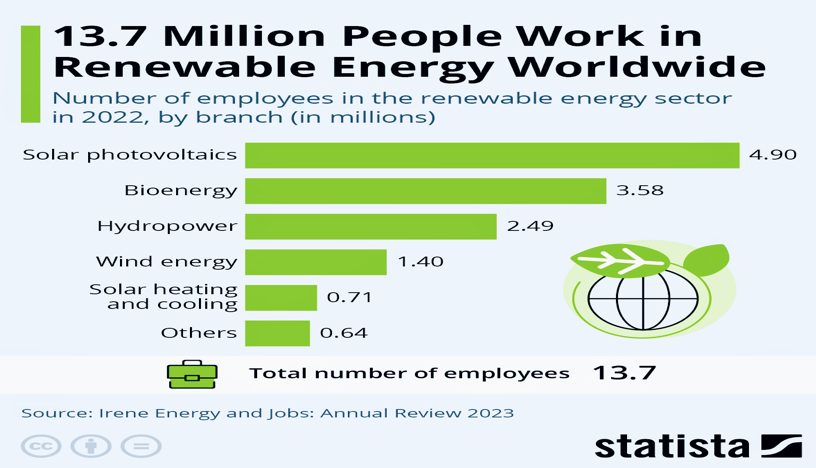 ขณะที่ส่วนที่เหลือซึ่งมากกว่า 1 ล้านล้านเหรียญสหรัฐฯ เล็กน้อยนั้น เป็นการลงทุนในถ่านหิน Coal, ก๊าซธรรมชาติ Natural Gas และน้ำมัน Oil .. ตั้งแต่ปี 2565 เป็นต้นมา การลงทุนร่วมกันในพลังงานทดแทน Renewables และโครงข่ายระบบสายส่งกำลังไฟฟ้า Power Grids ขึ้นแซงหน้าปริมาณการใช้จ่ายสำหรับเชื้อเพลิงฟอสซิล Amount Spent on Fossil Fuels เป็นครั้งแรก รวมทั้งอุตสาหกรรมพลังงานหมุนเวียน Renewable Energy Industry ได้สร้างตำแหน่งงานที่เกี่ยวข้องทั่วโลกได้ อยู่ที่ 13.7 ล้านตำแหน่ง ในปี 2565 ซึ่งมากกว่าที่เศรษฐกิจเชื้อเพลิงฟอสซิล Fossil Fuel Economy จะสามารถทำได้ ..