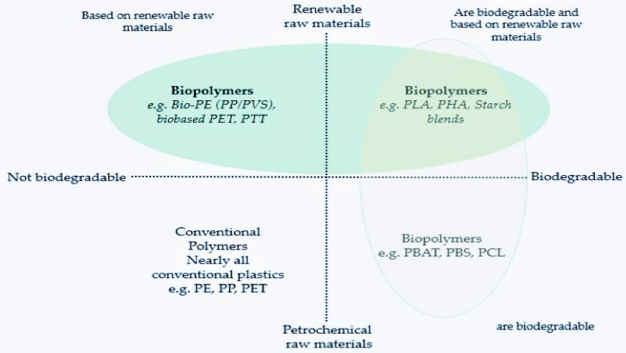 นอกจากนี้ พวกมันยังถูกแบ่งออกเป็นประเภทต่าง ๆ ได้อีก เช่น โพลิแลกติกแอซิด Polylactic Acid: PLA, โพลิไฮดรอกซีอัลคาโนเอต Polyhydroxyalkanoate: PHA, ไบโอพลาสติกจากแป้ง Starch – Based Bioplastics และไบโอพลาสติกจากเซลลูโลส Cellulose – Based Bioplastics .. อย่างไรก็ตาม ไบโอพลาสติก Bioplastics บางประเภท แม้จะเป็นวัสดุชีวภาพ Biobased แต่ก็ไม่สามารถย่อยสลายได้ทางชีวภาพ Not Biodegradable เช่น โพลิเอทิลีน Polyethylene: PE หรือโพลิเอทิลีนเทเรฟทาเลต Polyethylene Terephthalate: PET เป็นต้น ..