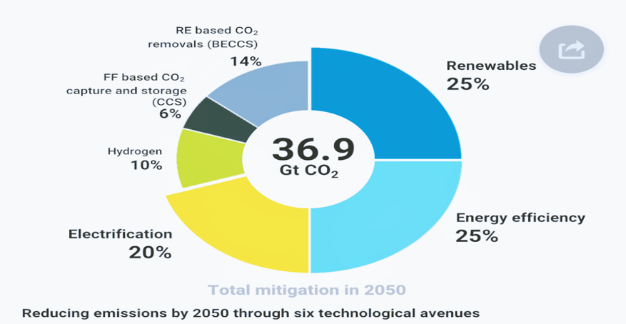 สำนักงานพลังงานระหว่างประเทศ International Energy Agency: IEA ชี้ว่า การเพิ่มพลังงานหมุนเวียน Ramping up Renewables, การปรับปรุงประสิทธิภาพการใช้พลังงาน Improving Energy Efficiency, การลดการปล่อยก๊าซมีเทน Cutting Methane: CH4 Emissions และการเพิ่มการปรับไปใช้พลังงานไฟฟ้า Increasing Electrification ด้วยเทคโนโลยีที่มีอยู่ในปัจจุบัน จะสามารถช่วยลดการปล่อยก๊าซเรือนกระจกได้มากกว่า 80 % ที่จำเป็น ภายในปี 2573 ..