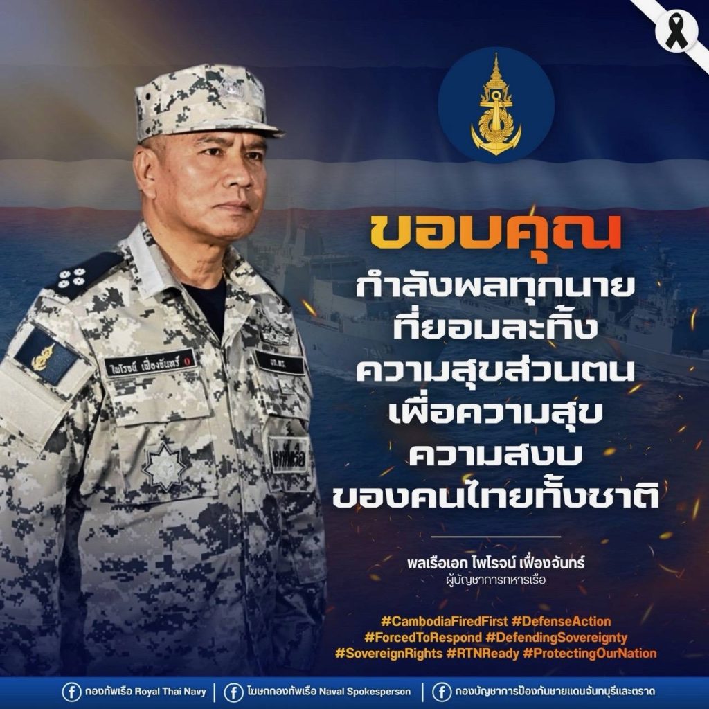 @@@……กองทัพเรือ….พล.ร.อ.ไพโรจน์ เฟื่องจันทร์ ผู้บัญชาการทหารเรือ มีความห่วงใยต่อกำลังพลทุกนายที่ปฏิบัติหน้าที่ในพื้นที่สู้รบและพื้นที่เสี่ยงภัยใกล้แนวชายแดนเป็นอย่างยิ่ง โดยติดตามสถานการณ์อย่างใกล้ชิด และกำชับให้ทุกหน่วยดูแลความปลอดภัย ความเป็นอยู่ สุขภาพและการสนับสนุนด้านต่าง ๆ แก่กำลังพลอย่างเต็มขีดความสามารถ กำลังพลทุกระดับชั้น ทุกนาย คือกำลังสำคัญของกองทัพเรือ และทุกคนกำลังปฏิบัติหน้าที่เพื่อความสงบและความปลอดภัยของประชาชนและประเทศชาติ จึงขอให้ทุกนายปฏิบัติงานด้วยความระมัดระวัง ยึดหลักยุทธวิธีอย่างเคร่งครัด พร้อมดูแลกันและกันในทุกสถานการณ์