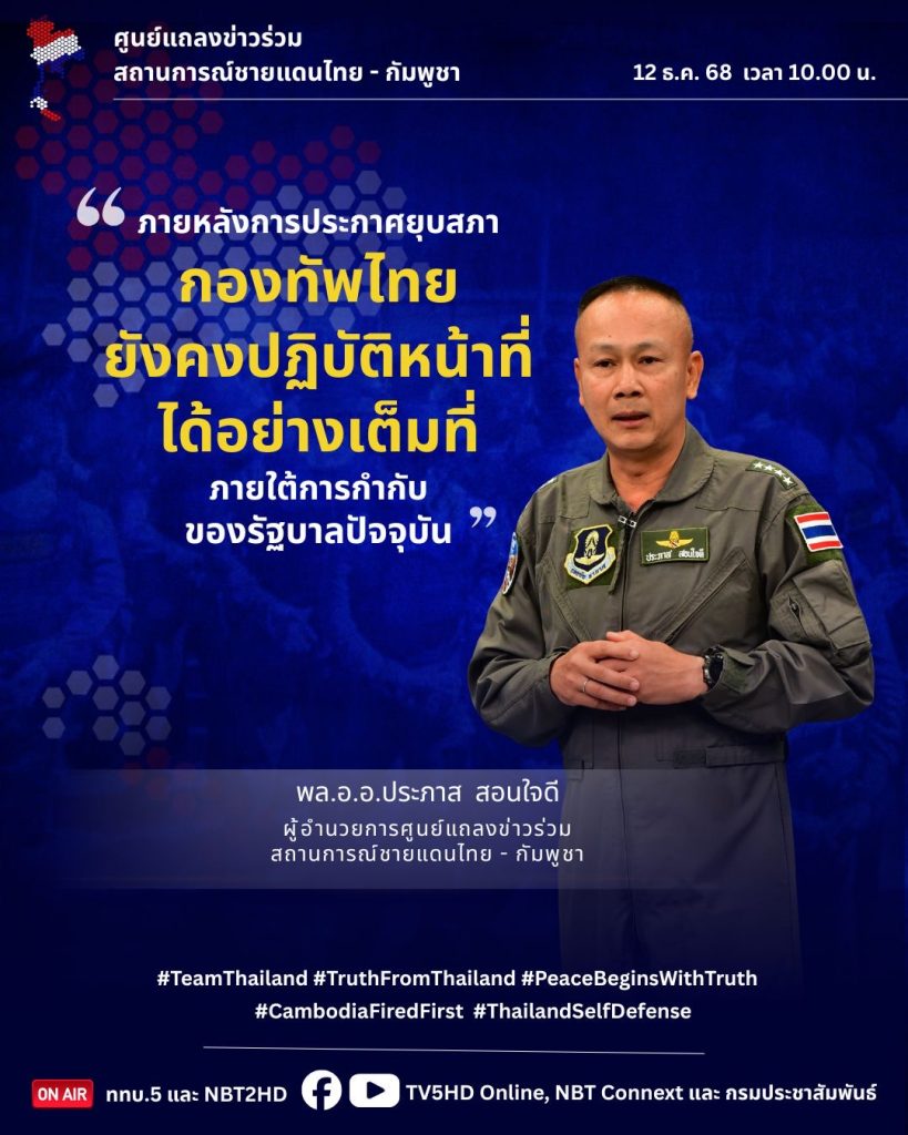 @@@……กองทัพอากาศ…..พล.อ.อ.ประภาส สอนใจดี ผู้อำนวยการศูนย์แถลงข่าวร่วมสถานการณ์ไทย-กัมพูชา เปิดเผยว่า แม้มีการยุบสภาเมื่อวันที่ 11 ธ.ค.ที่ผ่านมา แต่รัฐบาลยังคงปฏิบัติหน้าที่ และมีอำนาจดูแลความมั่นคงของประเทศอย่างครบถ้วนตามกฎหมาย เพื่อให้การปกป้องประชาชนไทยเป็นไปอย่างต่อเนื่อง สถานการณ์ชายแดนมีความตึงเครียดจากการที่กัมพูชาดำเนินการรุกล้ำ และโจมตีไทยก่อน ในหลายพื้นที่ กองทัพไทยจึงจำเป็นต้องใช้สิทธิในการป้องกันตนเองตามกฎหมายไทยและกฎหมายระหว่างประเทศ โดยมุ่งหมายเพียงเพื่อยุติการคุกคามชีวิตประชาชน และรักษาอธิปไตยของชาติ