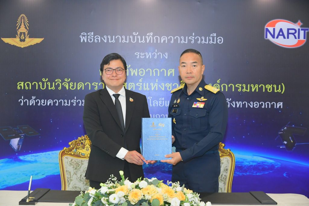 @@@……กองทัพอากาศ.….พล.อ.อ.เสกสรร คันธา ผู้บัญชาการทหารอากาศ พร้อมด้วย ดร.วิภู รุโจปการ ผู้อำนวยการสถาบันวิจัยดาราศาสตร์แห่งชาติ (องค์การมหาชน) ร่วมลงนามบันทึกความร่วมมือระหว่าง กองทัพอากาศ และ สถาบันวิจัยดาราศาสตร์แห่งชาติ (องค์การมหาชน) ว่าด้วยความร่วมมือด้านเทคโนโลยีด้านอวกาศและการเฝ้าระวังทางอวกาศ โดยมี นายทหารชั้นผู้ใหญ่กองทัพอากาศ และคณะสถาบันวิจัยดาราศาสตร์แห่งชาติ (องค์การมหาชน) ร่วมพิธี ณ ห้องรับรองบริพัตร กองบัญชาการกองทัพอากาศ ทั้งนี้ กองทัพอากาศและสถาบันวิจัยดาราศาสตร์แห่งชาติ (องค์การมหาชน) ได้ตระหนักถึงความสำคัญของการพัฒนาเทคโนโลยีด้านอวกาศและการเฝ้าระวังทางอวกาศ ซึ่งในสถานการณ์ปัจจุบันนับได้ว่ามีบทบาทอย่างยิ่งในการสนับสนุนภารกิจด้านความมั่นคง และเทคโนโลยีการป้องกันประเทศ ตลอดจนภารกิจด้านการช่วยเหลือประชาชนของกองทัพอากาศ