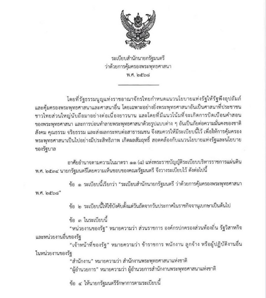 นั่นคือ ระเบียบสำนักนายกรัฐมนตรี ว่าด้วยการคุ้มครองพระพุทธศาสนา พ.ศ.2568