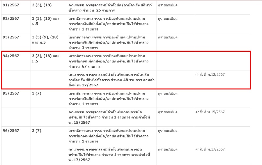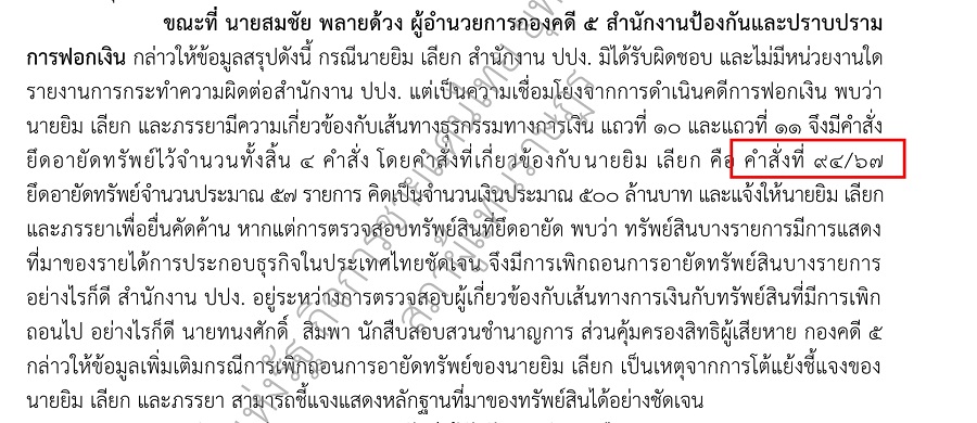 ส่วนคําสั่ง ที่ ย. 94/2567 ลงวันที่ 24 เมษายน 2567 ที่เกี่ยวข้องกับนายยิม เลียก มีการตามยึดอายัดทรัพย์ไว้ 67 รายการ มูลค่ากว่า 500 ล้านบาท ต่อมาคณะกรรมการธุรกรรม มีคำสั่ง ตามคำสั่งที่ พ. 12/2567 เพิกถอน คณะกรรมการธุรกรรมมีคำสั่งเพิกถอนการยึดหรืออายัดทรัพย์สินไว้ชั่วคราว 48 รายการ