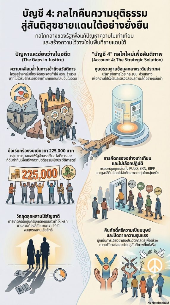 ความสำคัญของ “บัญชี 4” จึงไม่ใช่แค่การจัดหมวดหมู่ข้อมูล แต่คือการเยียวยาเชิงประวัติศาสตร์เพื่อปิดฉากความรุนแรง เปิดประตูสู่โอกาสใหม่ให้กับทุกคนในพื้นที่จังหวัดชายแดนภาคใต้