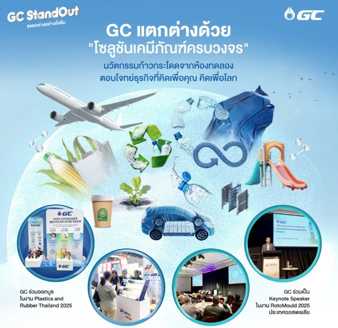 นวัตกรรมของ GC ไม่เพียงแต่เกิดขึ้นในห้องทดลอง แต่ยังถูกนำไปแสดงบนเวทีระดับนานาชาติอย่างภาคภูมิ ไม่ว่าจะเป็น งาน Plastics and Rubber Thailand 2025 ที่กรุงเทพฯ หรืองาน RotoMould 2025 ที่ออสเตรเลีย ในทั้งสองเวที GC ได้เปิดตัวผลิตภัณฑ์และโซลูชันที่สะท้อนถึงความสามารถของไทยในการพัฒนาเคมีภัณฑ์และพลาสติกอย่างยั่งยืน และที่สำคัญคือสามารถปรับใช้ได้จริงในภาคอุตสาหกรรม โดยเวที Plastics and Rubber Thailand 2025 ที่กรุงเทพฯ GC ขนทัพนวัตกรรมเคมีภัณฑ์รักษ์โลกกับผลิตภัณฑ์กลุ่ม Low Carbon & Sustainability Products อย่าง Recyclable, Recycled, Bioplastic และ Purging Compound ผลิตภัณฑ์ที่มีประสิทธิภาพสูงและเป็นมิตรต่อสิ่งแวดล้อม นี่คือตัวอย่างของการนำนวัตกรรมมาผสานกับความต้องการของตลาดได้อย่างลงตัว