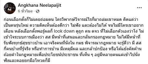 เมื่อวันที่ 9 ก.พ. นางอังคณา นีละไพจิตร สมาชิกวุฒิสภา และอดีตกรรมการสิทธิมนุษยชนแห่งชาติ ได้โพสต์เฟซบุ๊ก Angkhana Neelapaijit หลังผลการเลือกตั้งวันที่ 8 ก.พ. ออกมาอย่างไม่เป็นทางการ ว่า พรรคภูมิใจไทยได้จำนวนสส.มากที่สุดและจะได้เป็นแกนนำจัดตั้งรัฐบาล ขณะที่พรรคประชาชน ได้คะแนนเป็นลำดับ 2 พร้อมภาพการเลือกสส.เขตกรุงเทพมหานคร ที่พรรคประชาชนกวาดครบทั้ง 33 เขต โดยระบุว่า ก่อนเลือกตั้งก็ไม่เคยถ่อมตน ใครวิพากษ์วิจารณ์ไรก็มาถล่มเขาหมด คิดแต่ว่าเป็นคนรุ่นใหม่ ความคิดเห็นต้องดีกว่า ไม่ฟัง แตะต้องไม่ได้ จนไม่มีใครเขาอยากเตือน หลังเลือกตั้งพอรู้ผลก็ look down ดูถูก คน ตจว ที่ไม่เลือกตัวเองว่าโง่ ไม่เข้าใจระบบการเมืองว่า สส มีหน้าที่เสนอและกลั่นกรองกฎหมาย ไม่ได้มีหน้าที่รับฟังทุกข์สุขชาวบ้าน เอาจริงคนที่นั่งใน กมธ พิจารณากฎหมาย จะรู้ดีว่า มี สส กี่คนบ้างที่รู้จริง หรือทำการบ้าน มีเหตุมีผล และกล้าปกป้อง หรือโต้แย้งคัดค้านถ้อยคำในกฎหมายเพื่อประโยชน์ประชาชน ที่เห็น ๆ อยู่มีหลายคนแค่เข้าไปนั่งฟังและคอยยกมือโหวตก็มี.