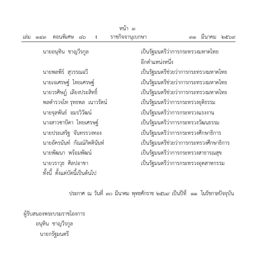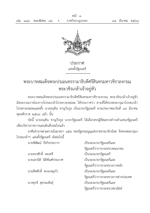 พระบาทสมเด็จพระปรเมนทรรามาธิบดีศรีสินทรมหาวชิราลงกรณ พระวชิรเกล้าเจ้าอยู่หัว มีพระบรมราชโองการโปรดเกล้าฯ ให้ประกาศว่า ตามที่ได้ทรงพระกรุณาโปรดเกล้าโปรดกระหม่อมแต่งตั้ง นายอนุทิน ชาญวีรกูล เป็นนายกรัฐมนตรี ตามประกาศลงวันที่ 19 มีนาคม พุทธศักราช 2569 แล้วนั้น