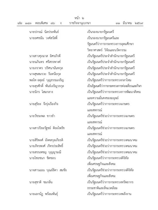 เมื่อวันที่ 31 มี.ค.2569 เว็บไซต์ ราชกิจจานุเบกษา เผยแพร่พระบรมราชโองการให้ประกาศแต่งตั้งรัฐมนตรี ความว่า