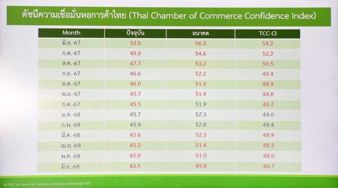 นายธนวรรธน์ พลวิชัย อธิการบดีและประธานที่ปรึกษาศูนย์พยากรณ์เศรษฐกิจและธุรกิจ มหาวิทยาลัยหอการค้าไทย เปิดเผย ว่า ดัชนีความเชื่อมั่นของผู้บริโภค เดือน มิ.ย. 68 อยู่ที่ระดับ 52.7 ปรับตัวลดลงจากเดือนพ.ค. ที่ระดับ 54.2 โดยเป็นการปรับตัวลดลงในทุกรายการ ลดลงต่อเนื่องเป็นเดือนที่ 5 และอยู่ในระดับที่ต่ำสุดในรอบ 28 เดือนนับตั้งแต่เดือนมี.ค. 66 เป็นต้นมา ขณะที่ดัชนีความเชื่อมั่นเกี่ยวกับเศรษฐกิจไทยโดยรวม อยู่ที่ 46.7 ดัชนีความเชื่อมั่นเกี่ยวกับโอกาสในการหางาน อยู่ที่ 50.6 และดัชนีความเชื่อมั่นเกี่ยวกับรายได้ในอนาคต อยู่ที่ 60.9