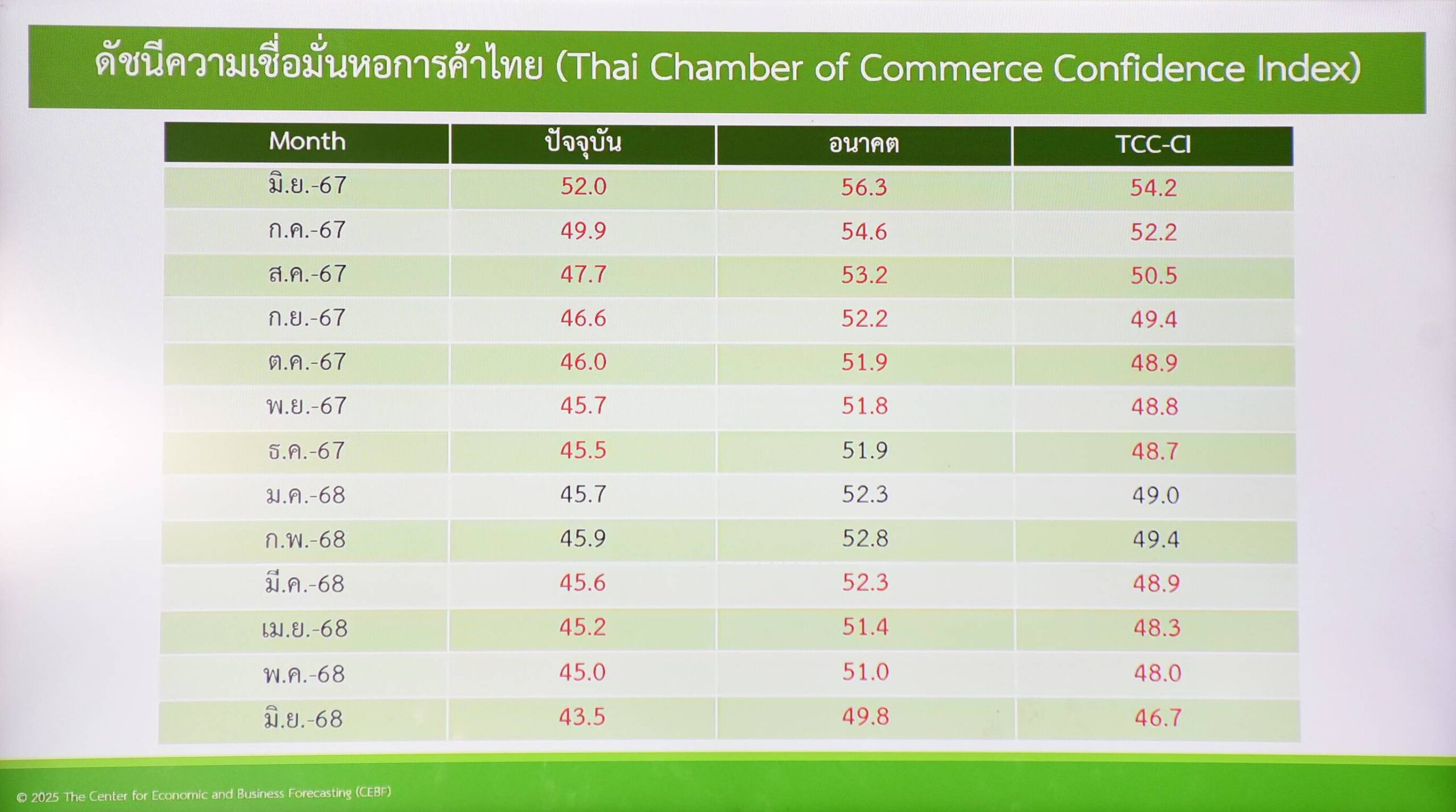 ส่วนดัชนีความเชื่อมั่นหอการค้าไทย เดือน มิ.ย.68 อยู่ที่ 46.7 ลดลงต่อเนื่องเป็นเดือนที่ 4 และต่ำสุดในรอบ 30 เดือน จากความกังวลปัญหาการเมืองในประเทศ กำแพงภาษีสหรัฐฯ การท่องเที่ยวและเศรษฐกิจยังไม่ฟื้น แต่ที่น่าตกใจ คือ ระดับการจ้างงานมีค่าต่ำกว่า 40 โดยภาคธุรกิจต้องการให้รัฐบาลเร่งมาตรการกระตุ้นเศรษฐกิจเพื่อเพิ่มกำลังซื้อ เร่งเจรจาต่อรองภาษีกับสหรัฐฯให้เหลือต่ำกว่า36% เร่งปล่อยสินเชื่อเข้าสู่ระบบมากขึ้น รวมทั้งหามาตรการป้องกันและรับมือกับสถานการณ์ชายแดนไทย-กัมพูชา ไม่ให้เกิดความสูญเสีย