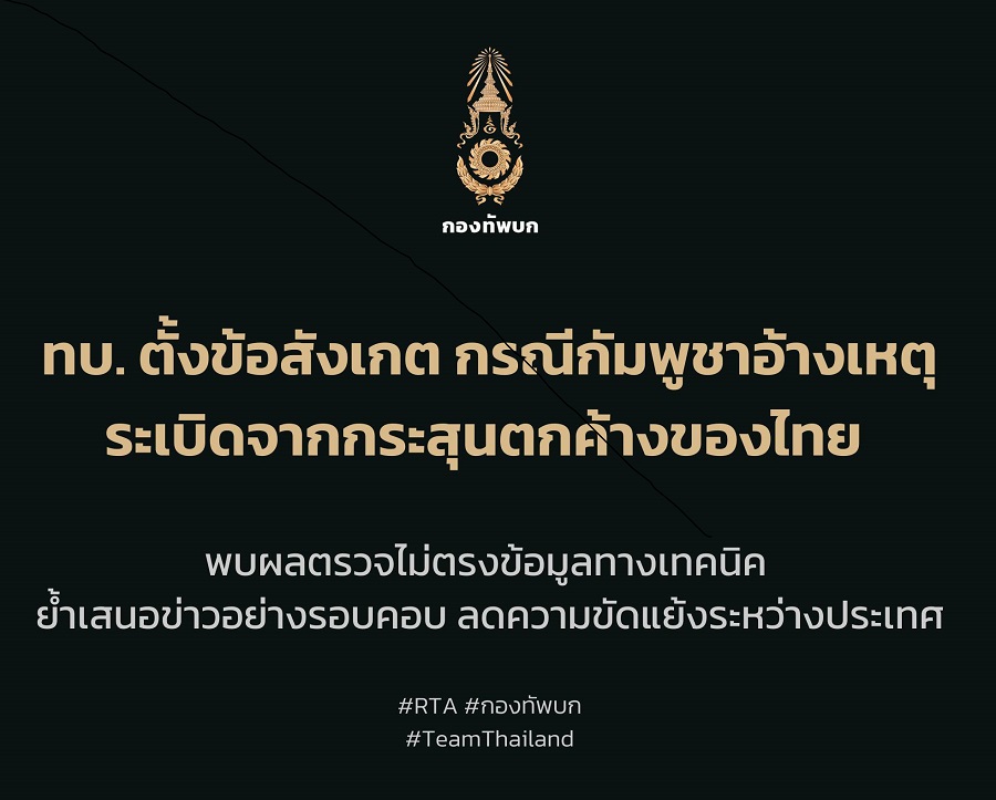 กองทัพบกตั้งข้อสังเกต กรณีกัมพูชาอ้างเหตุระเบิดจากกระสุนตกค้างของไทย พบผลตรวจไม่ตรงข้อมูลทางเทคนิค ย้ำควรนำเสนอข่าวอย่างรอบคอบเพื่อส่งเสริมกระบวนการลดความขัดแย้งระหว่างประเทศ