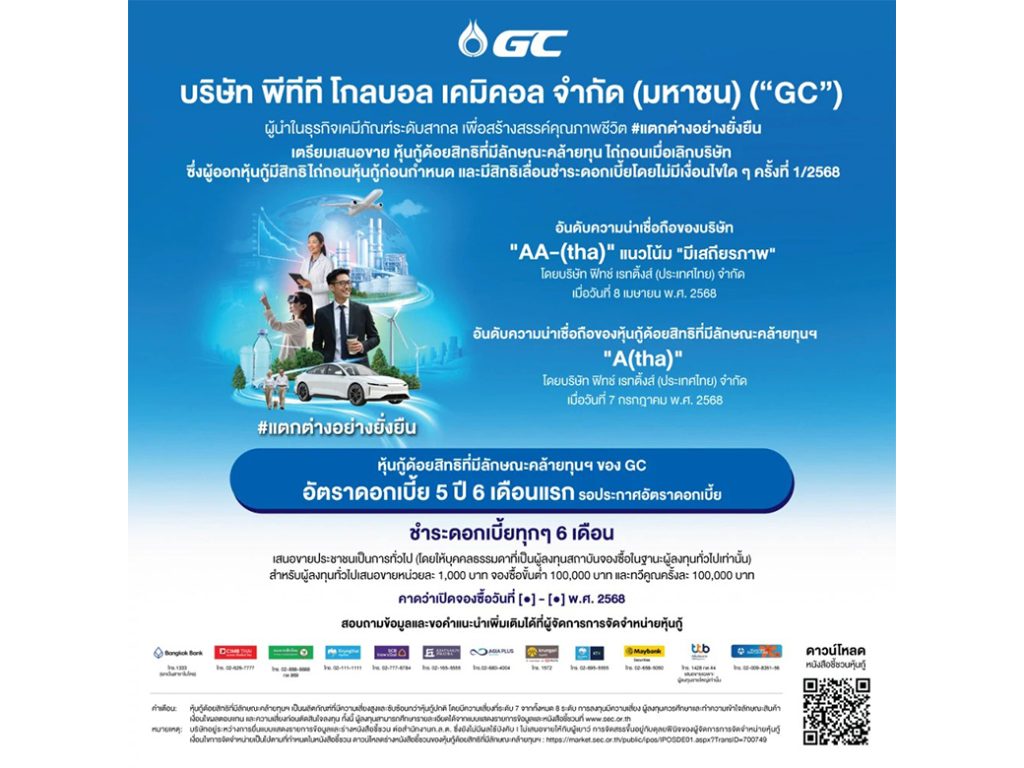 GC เตรียมออกหุ้นกู้ด้อยสิทธิที่มีลักษณะคล้ายทุนฯ สกุลเงินบาท ชุดใหม่ รับกระแสเชิงบวกจากนักลงทุน หนุนแผนบริหารเงินทุนระยะยาว รองรับการเติบโตธุรกิจมูลค่าสูง–คาร์บอนต่ำ