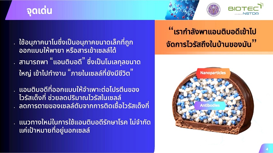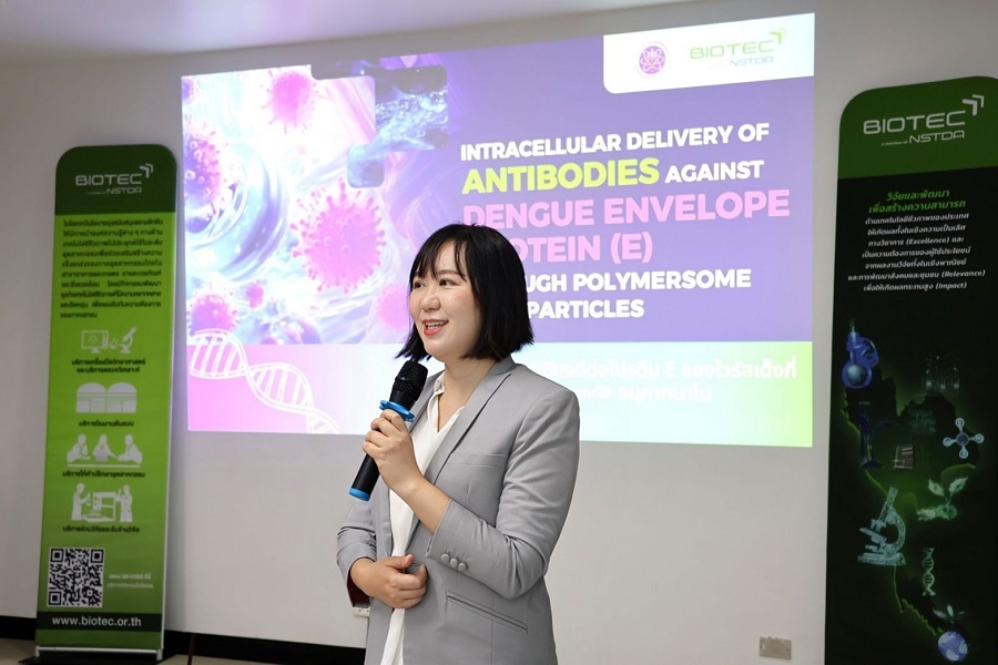 ดร.ร่มฉัตร ไกรว่อง นักวิจัยจากทีมวิจัยชีววิทยาโมเลกุลของไวรัสเด็งกี่และฟลาวิไวรัส กลุ่มวิจัยเทคโนโลยีชีวภาพระดับโมเลกุลทางการแพทย์ ศูนย์พันธุวิศวกรรมและเทคโนโลยีชีวภาพแห่งชาติ (ไบโอเทค) สำนักงานพัฒนาวิทยาศาสตร์และเทคโนโลยีแห่งชาติ (สวทช.) ในฐานะหัวหน้าโครงการวิจัยเรื่อง “การนำส่งแอนติบอดีที่จำเพาะต่อโปรตีนของไวรัสเด็งกี่เข้าสู่เซลล์โดยใช้อนุภาคนาโนชนิดโพลีเมอร์ (Investigation of Dengue-infected Cells Treated with Antibody-Nanoparticles: Host and Viral Views)” พร้อมด้วย ผศ.ดร.นิสา ปฏิการมณฑล นักวิจัยร่วมในโครงการ อาจารย์ประจำภาควิชาเทคโนโลยีชีวภาพ คณะวิทยาศาสตร์ มหาวิทยาลัยมหิดล ได้นำเสนอความก้าวหน้าของงานวิจัย โดยงานวิจัยนี้มุ่งพัฒนาระบบอนุภาคนาโนชนิดโพลีเมอร์สำหรับนำส่งแอนติบอดีที่จำเพาะต่อเชื้อไวรัสเด็งกี่เข้าสู่เซลล์มนุษย์โดยตรง เพื่อเพิ่มประสิทธิภาพและความแม่นยำในการรักษาโรคไข้เลือดออก