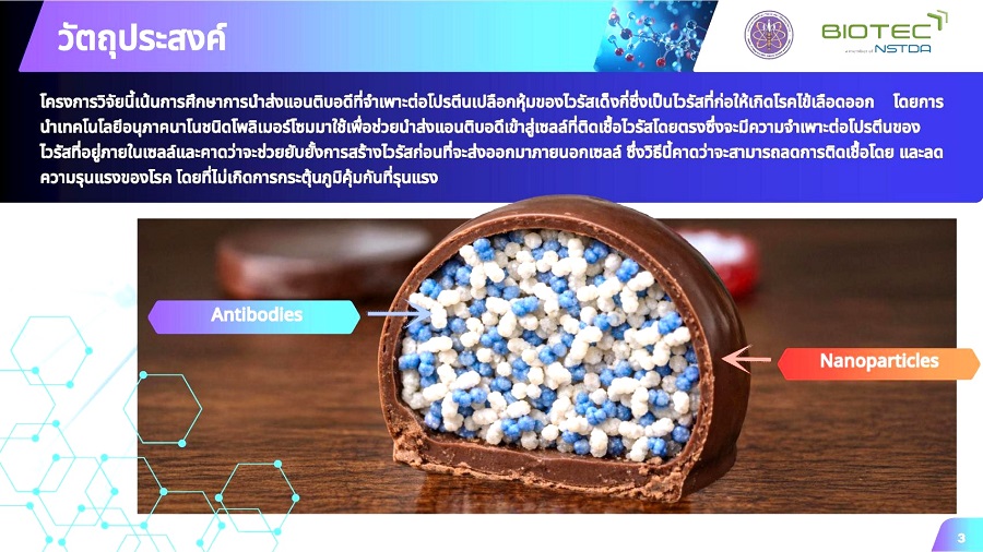 โครงการวิจัยพัฒนาเทคโนโลยีอนุภาคนาโนสำหรับนำส่งแอนติบอดี เพื่อการรักษาโรคไข้เลือดออกของไทย ได้รับการคัดเลือกภายใต้กรอบทศวรรษสากลแห่งวิทยาศาสตร์เพื่อการพัฒนาอย่างยั่งยืนขององค์การยูเนสโก สะท้อนบทบาทของประเทศไทยในการขับเคลื่อนองค์ความรู้ทางวิทยาศาสตร์เพื่อแก้ไขปัญหาสุขภาพระดับโลก พร้อมเสริมสร้างความมั่นคงด้านสุขภาพของประเทศ