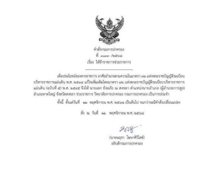 ทั้งนี้ ตั้งแต่วันที่ 26 พฤศจิกายน พ.ศ. 2568 เป็นต้นไป จนกว่าจะมีคำสั่งเปลี่ยนแปลง สั่ง ณ วันที่ 26 พฤศจิกายน พ.ศ. 2568 ลงชื่อ นายนฤชา โฆษาศิวิไลซ์ อธิบดีกรมการปกครอง