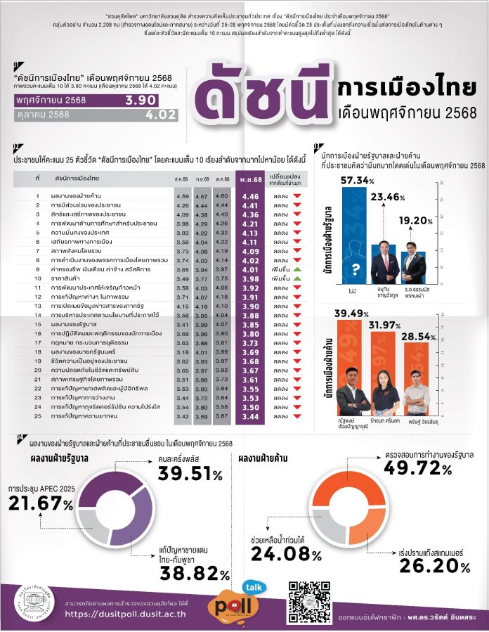 เมื่อวันที่ 30 พ.ย.สวนดุสิตโพล มหาวิทยาลัยสวนดุสิต เผยผลสำรวจ “ดัชนีการเมืองไทย ประจำเดือนพฤศจิกายน 2568” จากกลุ่มตัวอย่าง 2,208 คนทั่วประเทศ เก็บข้อมูลระหว่างวันที่ 25–28 พฤศจิกายน 2568 พบว่าคะแนนภาพรวมดัชนีการเมืองไทยเฉลี่ยอยู่ที่ 3.90 คะแนน ลดลงจากเดือนตุลาคมซึ่งได้ 4.02 คะแนน
