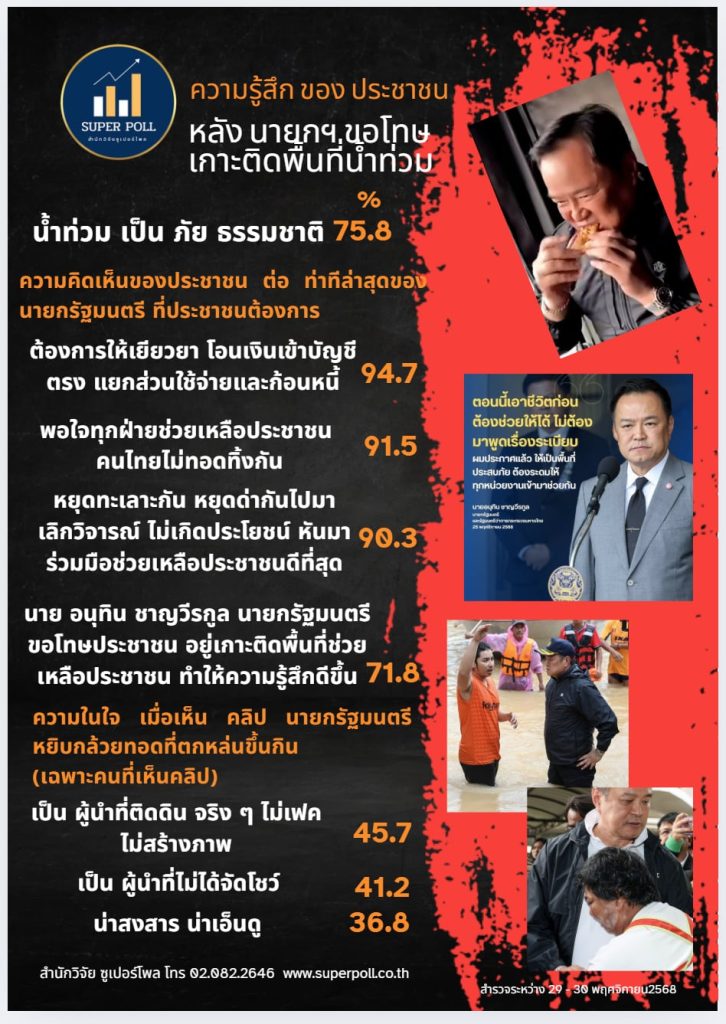 เมื่อวันที่ 30 พ.ย.สำนักวิจัยซูเปอร์โพลได้ดำเนินการสำรวจความคิดเห็นประชาชนทุกสาขาอาชีพทั่วประเทศ เพื่อศึกษาความรู้สึก ความต้องการ และมุมมองของประชาชนต่อเหตุการณ์มหาอุทกภัยภาคใต้ รวมถึงท่าทีของนายกรัฐมนตรี นายอนุทิน ชาญวีรกูล ที่ได้ออกมาขอโทษประชาชน ยอมรับความบกพร่อง และลงพื้นที่ให้ความช่วยเหลือด้วยตัวเองอย่างต่อเนื่อง ผลสำรวจนี้สะท้อนภาพรวมของ “ความรู้สึกใหม่”หลังเหตุการณ์น้ำท่วมใหญ่ ซึ่งเป็นทั้งวิกฤตของภัยธรรมชาติ และบททดสอบสำคัญของรัฐบาลชุดปัจจุบัน