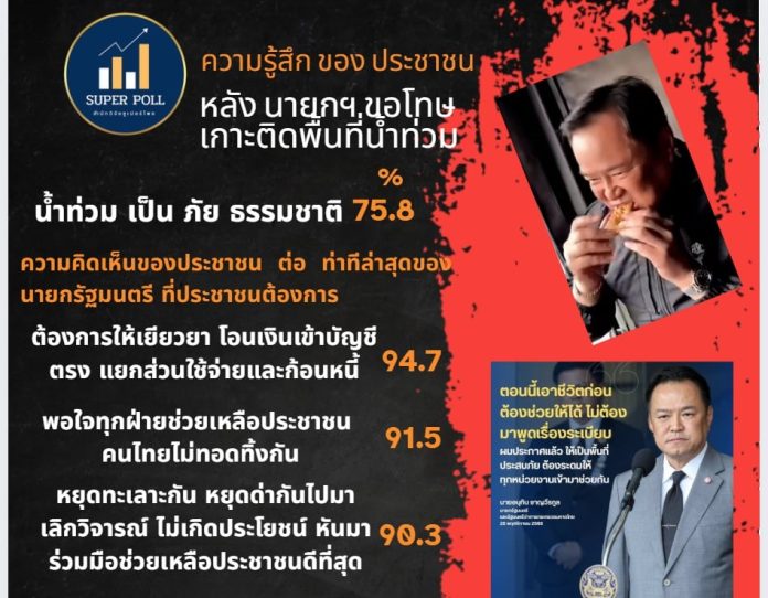 เมื่อวันที่ 30 พ.ย.สำนักวิจัยซูเปอร์โพลได้ดำเนินการสำรวจความคิดเห็นประชาชนทุกสาขาอาชีพทั่วประเทศ เพื่อศึกษาความรู้สึก ความต้องการ และมุมมองของประชาชนต่อเหตุการณ์มหาอุทกภัยภาคใต้ รวมถึงท่าทีของนายกรัฐมนตรี นายอนุทิน ชาญวีรกูล ที่ได้ออกมาขอโทษประชาชน ยอมรับความบกพร่อง และลงพื้นที่ให้ความช่วยเหลือด้วยตัวเองอย่างต่อเนื่อง ผลสำรวจนี้สะท้อนภาพรวมของ “ความรู้สึกใหม่”หลังเหตุการณ์น้ำท่วมใหญ่ ซึ่งเป็นทั้งวิกฤตของภัยธรรมชาติ และบททดสอบสำคัญของรัฐบาลชุดปัจจุบัน