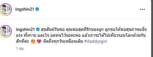 “อิ๊งค์”โพสต์ภาพซาบซึ้งคู่ ทักษิณ ชินวัตร พร้อมข้อความส่งกำลังใจให้คุณพ่อสุขภาพแข็งแรง อดทนไว้ และรอวันที่จะได้ออกเดินทางท่องโลกร่วมกันอีกครั้ง สะท้อนสายสัมพันธ์อบอุ่นของครอบครัวชินวัตรที่ยังคงเหนียวแน่นไม่เสื่อมคลาย.