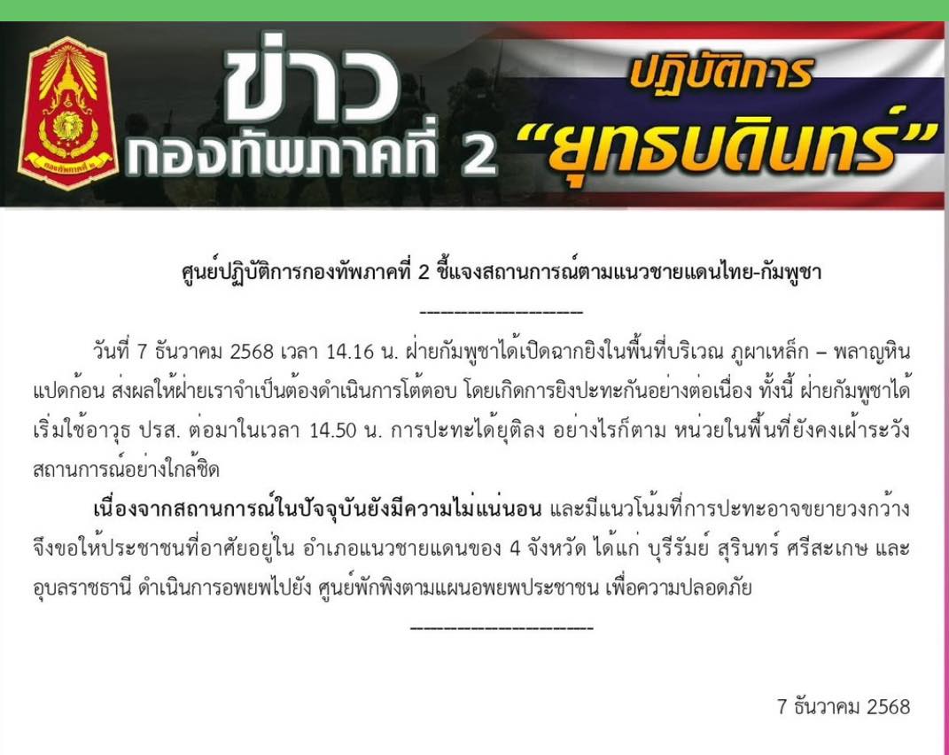 เมื่อเวลา 14.16 น.วันที่ 7 ธ.ค. ศูนย์ปฏิบัติการกองทัพภาคที่ 2 ชี้แจงสถานการณ์ตามแนวชายแดนไทย-กัมพูชา ฝ่ายกัมพูชา ได้เปิดฉากยิงในพื้นที่บริเวณ ภูผาเหล็ก-พลาญหินแปดก้อน ส่งผลให้ฝ่ายเราจำเป็นต้องดำเนินการโต้ตอบ โดยเกิดการยิงปะทะกันอย่างต่อเนื่อง ทั้งนี้ ฝ่ายกัมพูชาได้เริ่มใช้อาวุธ ปรส.