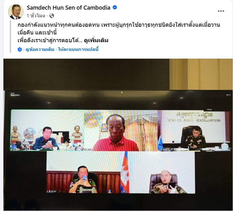 เมื่อวันที่ 8 ธ.ค.นายฮุนเซน อดีตนายกฯกัมพูชา โพสต์ข้อความระบุว่า กำลังแนวหน้าทั้งหมดต้องอดทนอดกลั้น เพราะฝ่ายผู้รุกรานกำลังใช้อาวุธทุกประเภทยิงโจมตีใส่เรา ตั้งแต่เมื่อวาน กลางคืนที่ผ่านมา และเช้าวันนี้ โดยมีเป้าหมายเพื่อยั่วยุให้เราตอบโต้