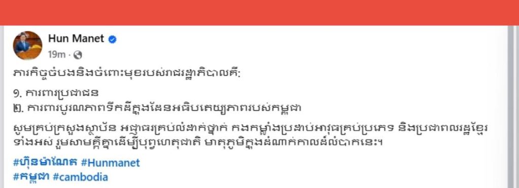 ‘ฮุน มาเนต’ ประกาศสั่งรัฐบาลปกป้องประชาชน ควบคู่กับการปกป้องบูรณภาพแห่งดินแดนภายใต้อธิปไตยของกัมพูชา เพื่อตอบโต้การโจมตีของไทย