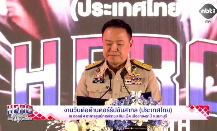 เมื่อเวลา 08.30 น. วันที่ 9 ธ.ค.ที่ฮอลล์ 4 ศูนย์แสดงสินค้าและการประชุมอิมแพ็ค เมืองทองธานี นายอนุทิน ชาญวีรกูล นายกรัฐมนตรีและรมว.มหาดไทย เป็นประธานในการประกาศเจตนารมณ์ต่อต้านการทุจริต ภายในงานวันต่อต้านคอร์รัปชันสากล (ประเทศไทย) “HERO OF THE TRUTH ร่วมหยุดคอร์รัปชัน” โดยมีประธาน คณะกรรมการป้องกันและปราบปรามการทุจริตแห่งชาติ (ป.ป.ช.) ประธานคณะกรรมการป้องกันและปราบปรามการทุจริตในภาครัฐ (ป.ป.ท.) และหน่วยงานที่เกี่ยวข้องเข้าร่วม
