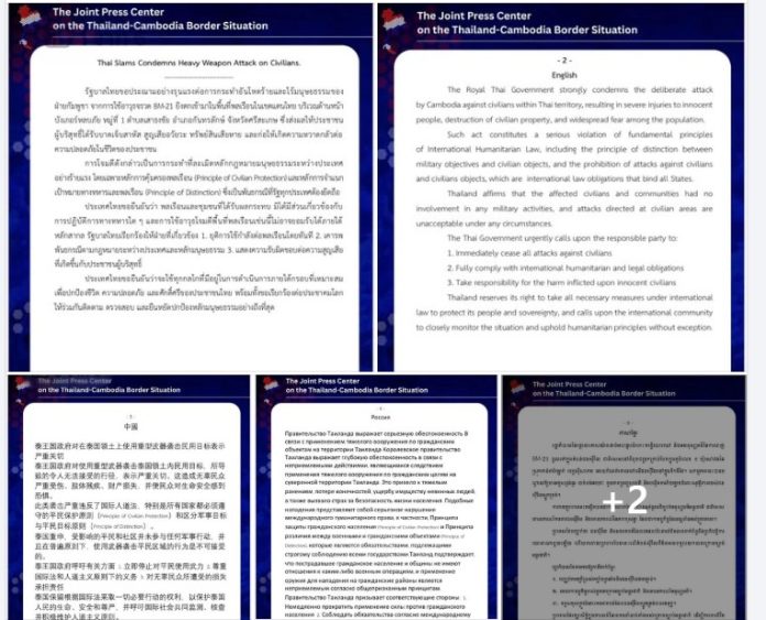 รัฐบาลออกแถลงการณ์ 6 ภาษา ประณามอย่างรุนแรงต่อการกระทำอันโหดร้ายและไร้มนุษยธรรมของฝ่ายกัมพูชา กรณียิงจรวด BM-21 มุ่งเป้าที่ประชาชนคนไทยผู้บริสุทธิ์ รัฐบาลไทยขอประณามอย่างรุนแรงต่อการกระทำอันโหดร้ายและไร้มนุษยธรรมของ ฝ่ายกัมพูชา
