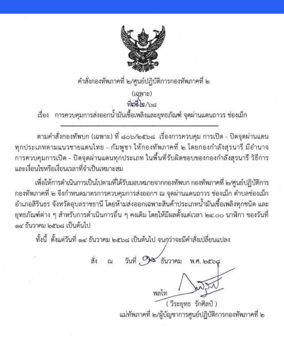 เมื่อวันที่ 15 ธ.ค.68 พล.ท.วีระยุทธ รักศิลป์ แม่ทัพภาคที่ 2 และผู้บัญชาการศูนย์ปฏิบัติการกองทัพภาคที่ 2 ลงนามในคำสั่งกองทัพภาคที่ 2 เรื่อง การควบคุมการส่งออกน้ำมันเชื้อเพลิงและยุทธภัณฑ์ จุดผ่านแดนถาวร ช่องเม็ก ระบุว่า ตามคำสั่งกองทัพบก (เฉพาะ) ที่ 806/2568 เรื่องการควบคุม การเปิด-ปิดจุดผ่านแดน ทุกประเภทตามแนวชายแดนไทย-กัมพูชา ให้กองทัพภาคที่ 2 โดยกองกำลังสุรนารี มีอำนาจการควบคุมการเปิด-ปิดจุดผ่านแดนทุกประเภท ในพื้นที่รับผิดชอบของกองกำลังสุรนารี วิธีการและเงื่อนไขหรือเงื่อนเวลาที่จำเป็นเหมาะสม เพื่อให้การดำเนินการเป็นไปตามที่ได้รับมอบหมายจากกองทัพบก กองทัพภาคที่ 2 /ศูนย์ปฏิบัติการกองทัพภาคที่ 2 จึงกำหนดมาตรการควบคุมการส่งออกฯ ณ จุดผ่านแดนถาวร ช่องเม็ก ตำบลช่องเม็ก อำเภอสิรินธร จังหวัดอุบลราชธานี โดยห้ามส่งออกเฉพาะสินค้าประเภทน้ำมันเชื้อเพลิงทุกชนิด และ ยุทธภัณฑ์ต่างๆ สำหรับการดำเนินการอื่น ๆ คงเดิม โดยให้มีผลตั้งแต่เวลา 24.00 นาฬิกาของวันที่ 14 ธันวาคม 2568 เป็นต้นไป