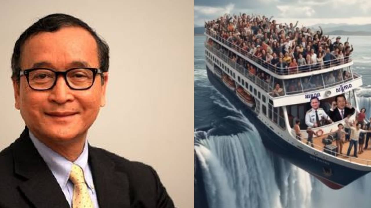 เมื่อวันที่ 19 ธ.ค.นายสม รังสี อดีตผู้นำฝ่ายค้านกัมพูชา ได้ออกมาเคลื่อนไหวบนโลกโซเชียลอย่างต่อเนื่อง โดยล่าสุดได้โพสต์รูปภาพเรือลำหนึ่งที่มี 2 พ่อลูก “ตระกูลฮุน” สมเด็จฮุนเซน และ ฮุน มาเนต อยู่บนหัวเรือ โดยบนเรือมีประชาชนชาวกัมพูชาอยู่เต็มลำ กำลังจะตกผาน้ำตกที่สูงชัน พร้อมโพสต์ข้อความว่า “สองพ่อลูกคู่นี้กำลังนำพาประเทศกัมพูชาไปสู่หายนะ”