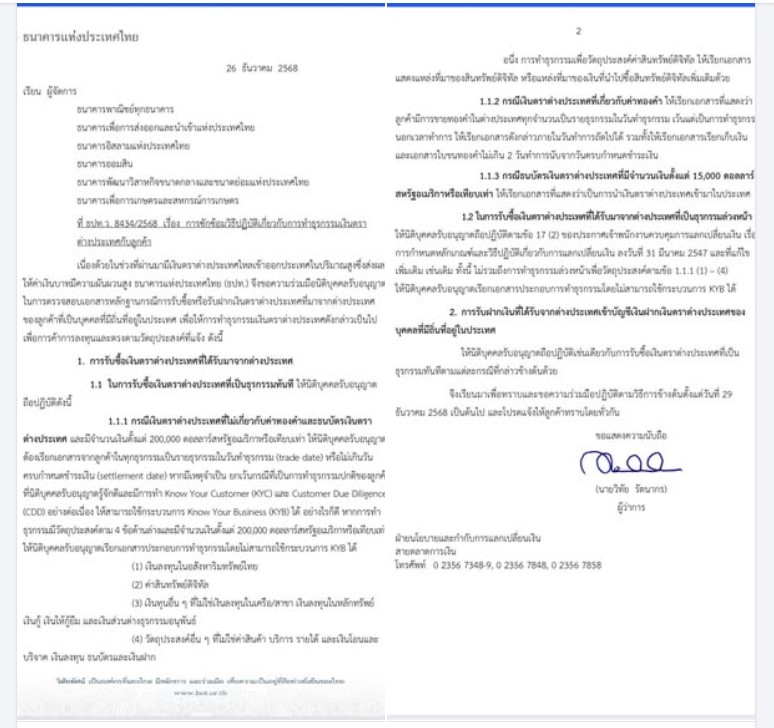 เมื่อวันที่ 26 ธ.ค.68 ธนาคารแห่งประเทศไทย (ธปท.) ออกหนังสือเวียนถึงผู้จัดการธนาคารพาณิชย์ทุกแห่ง รวมถึงสถาบันการเงินของรัฐ อาทิ ธนาคารเพื่อการส่งออกและนำเข้าแห่งประเทศไทย ธนาคารอิสลามแห่งประเทศไทย ธนาคารออมสิน ธนาคารพัฒนาวิสาหกิจขนาดกลางและขนาดย่อมแห่งประเทศไทย และธนาคารเพื่อการเกษตรและสหกรณ์การเกษตร เพื่อซักซ้อมแนวปฏิบัติในการทำธุรกรรมเงินตราต่างประเทศกับลูกค้าอย่างเข้มงวดมากขึ้น