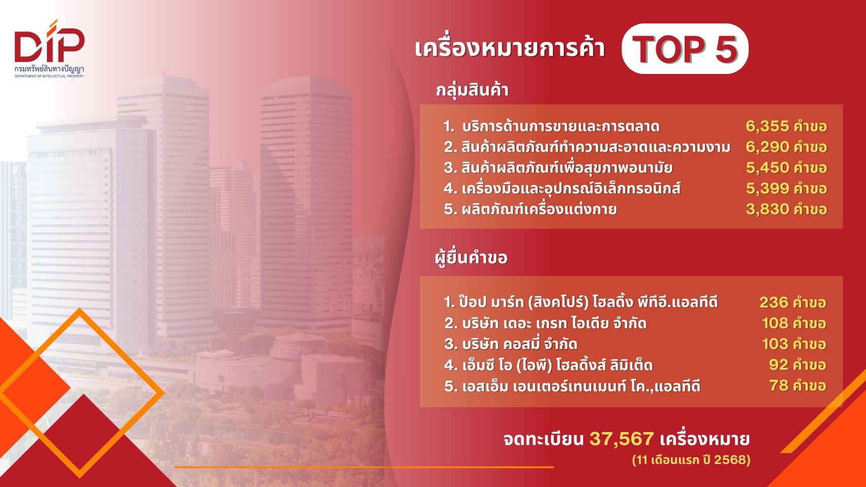 สำหรับผู้ยื่นคำขอมากที่สุด 5 อันดับแรก ได้แก่ ป๊อป มาร์ท (สิงคโปร์) โฮลดิ้ง พีทีอี.แอลทีดี (236 คำขอ) สะท้อนกระแสความนิยมของสินค้าอาร์ตทอยที่ยังคงแรงไม่ตกในไทย รองลงมาคือบริษัท เดอะ เกรท ไอเดีย จำกัด ในกลุ่มสินค้างานกราฟิก (108 คำขอ) บริษัท คอสมี่ จำกัด ในกลุ่มสินค้าเครื่องมือแพทย์ (103 คำขอ) เอ็มซี โอ (ไอพี) โฮลดิ้งส์ ลิมิเต็ด ในกลุ่มสินค้า เอ็นเตอร์เทนเมนต์คอมเพล็กซ์ (92 คำขอ) และเอสเอ็ม เอนเตอร์เทนเมนท์ โค.,แอลทีดี ในกลุ่มสินค้าคาแรคเตอร์ (78 คำขอ) ทั้งนี้ ตัวเลขการจดทะเบียนเครื่องหมายการค้า ในช่วง 11 เดือนแรกของปี 2568 อยู่ที่ 37,567 เครื่องหมาย เพิ่มขึ้น 41.52% เมื่อเทียบกับช่วงเวลาเดียวกันในปี 2567 (26,545 เครื่องหมาย)