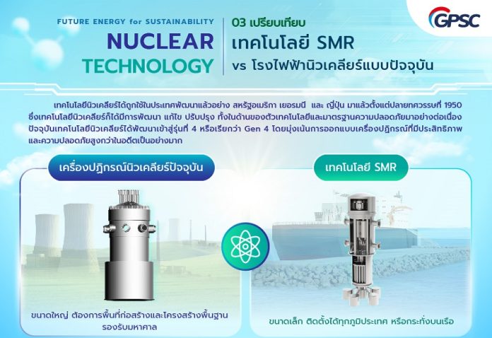 อีกทั้งไม่มีการปล่อยคาร์บอนไดออกไซด์ระหว่างกระบวนการผลิตไฟฟ้า อย่างไรก็ดี การพัฒนาโครงการโรงไฟฟ้า SMR จำเป็นต้องศึกษารายละเอียดหลายด้าน ทั้งการเลือกพื้นที่ที่เหมาะสม เทคโนโลยีเฉพาะ การจัดการความปลอดภัย และความคุ้มค่าทางเศรษฐกิจ ซึ่ง GPSC กำลังดำเนินการศึกษาอย่างรอบคอบตามกรอบแผนพัฒนากำลังผลิตไฟฟ้าของประเทศหรือ PDP 2024 ซึ่งได้กำหนดขนาดกำลังผลิตไว้ที่ 300 เมกะวัตต์ โดยคาดว่าจะเริ่มดำเนินการได้ในช่วงปลายแผนปี 2580